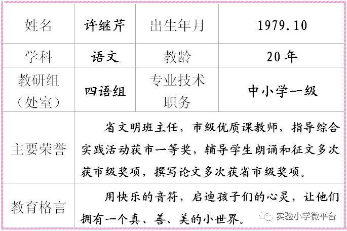 许继芹,中小学一级教师,省文明班主任,市级优质课教师,指导综合实践活动获市一等奖,辅导学生朗诵和征文多次获市级奖项,撰写论文多次获省市级奖项。