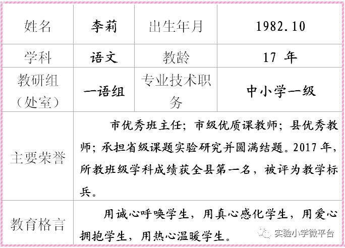 李莉,中小学一级教师,市优秀班主任;市级优质课教师;县优秀教师;承担省级课题实验研究并圆满结题。2017年,所教班级学科成绩获全县第一名,被评为教学标兵。