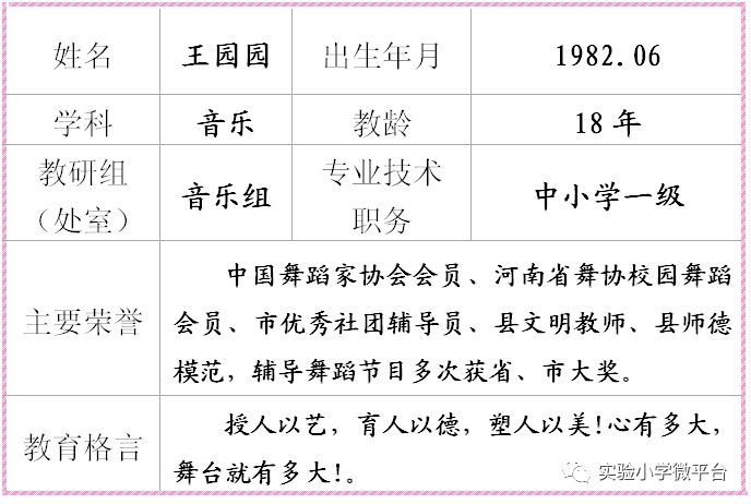 王园园,中小学一级教师,中国舞蹈家协会会员,河南省舞协校园舞蹈会员,市优秀社团辅导员,县文明教师,县师德模范,辅导舞蹈节目多次获省、市大奖。现任我校二年级舞蹈教师兼校舞蹈社团辅导员。