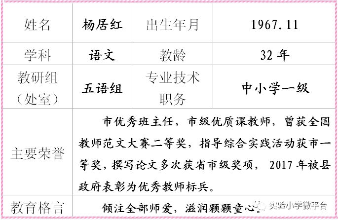 杨居红,中小学一级教师,市优秀班主任,市级优质课教师,曾获全国教师范文大赛二等奖,指导综合实践活动获市一等奖,撰写论文多次获省市级奖项, 2017年被县政府表彰为优秀教师标兵。