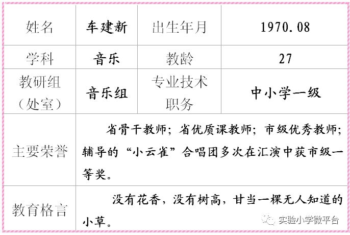 车建新,中小学一级教师,省骨干教师,省优质课教师,市级优秀教师,辅导的“小云雀”合唱团多次在汇演中获市级一等奖。