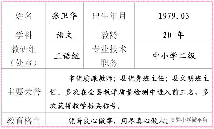 张卫华,中小学二级教师,市优质课教师;县优秀班主任;县文明班主任。多次在全县教学质量检测中进入前三名,多次获得教学标兵称号。