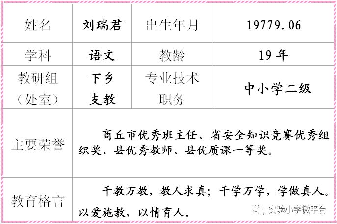 刘瑞君,中小学二级教师,商丘市优秀班主任、省安全知识竞赛优秀组织奖、县优秀教师、县优质课一等奖。