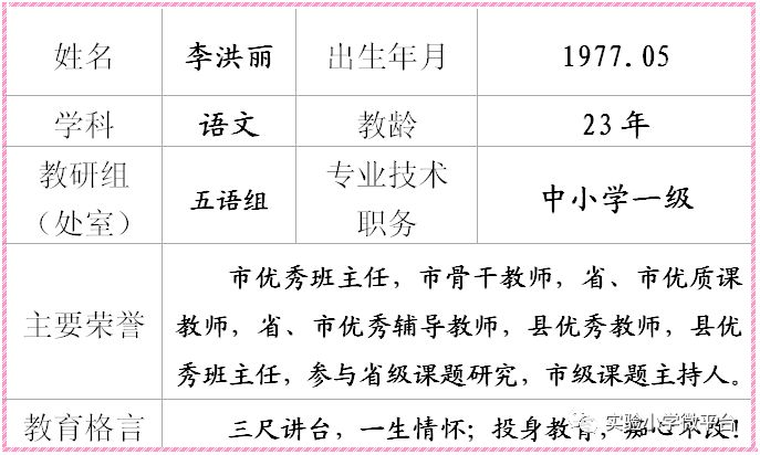 李洪丽,中小学一级教师,市优秀班主任,市骨干教师,省、市优质课教师,省、市优秀辅导教师,县优秀教师,县优秀班主任,参与省级课题研究,市级课题主持人。