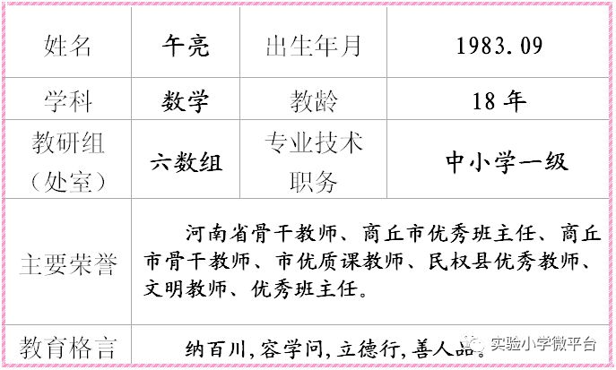 | 追求,永无止境 最美教师候选人午亮老师事迹简介 午亮,中小学一级教师,数学学士学位。河南省骨干教师、商丘市优秀班 |