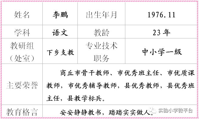 | 安静教书 踏实做人 最美教师候选人李鹏老师事迹简介 李鹏,中小学一级教师,商丘市骨干教师,市优秀班主任,市优质课一 |
