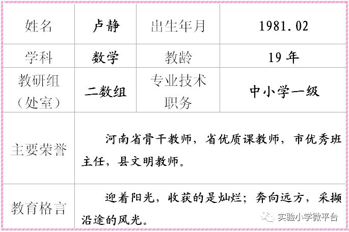 卢静,中小学一级教师,本科学历。河南省骨干教师、商丘市优秀班主任、商丘市骨干教师、省市优质课教师,现任我校二九班数学教师。